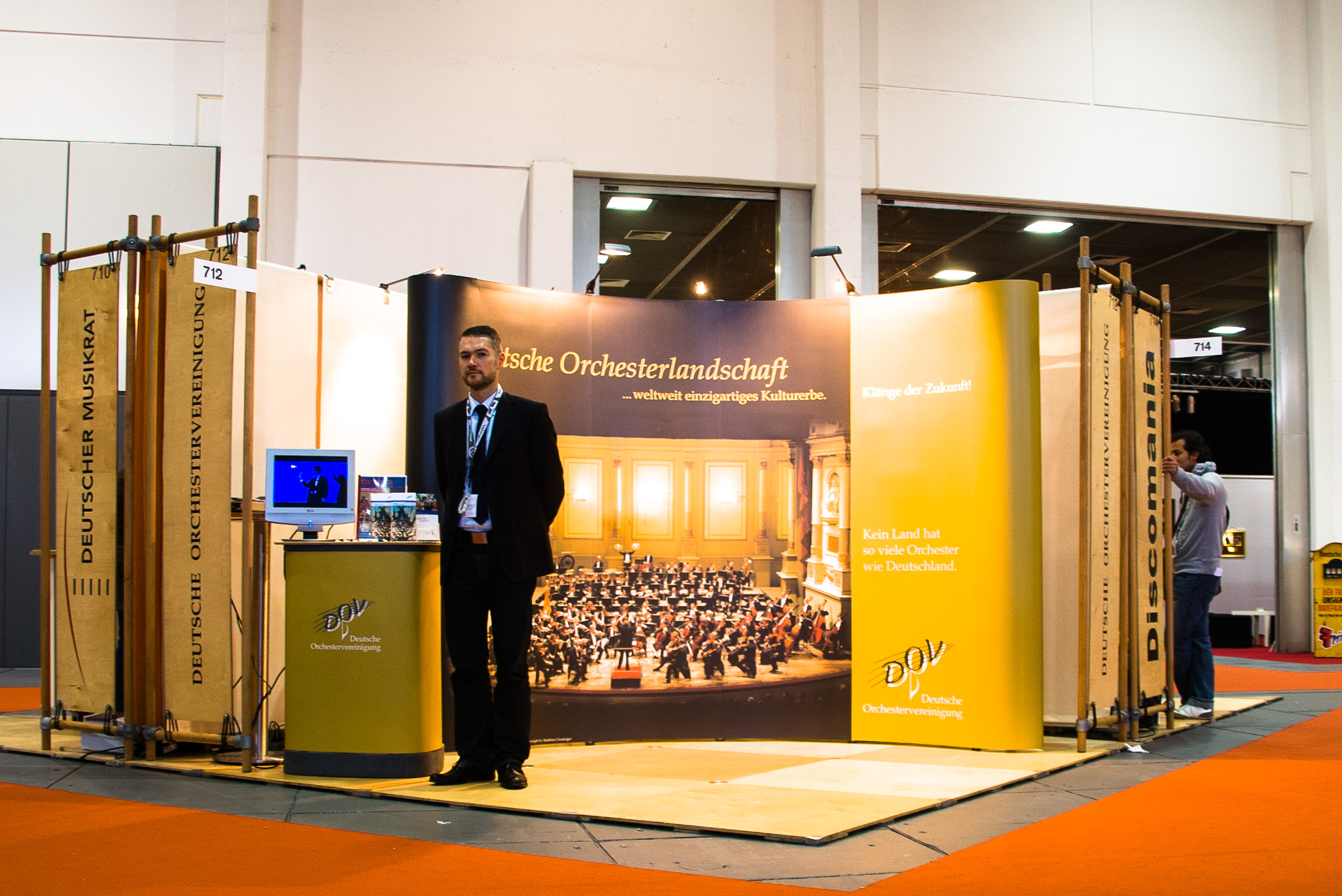 Stand 712. Die Deutsche Orchestervereinigung, die man vielleicht nicht ganz unbedingt auf so einer Messe erwarten würde. Auf dem Monitor laufen Bilder von Pultstars. Solti bis Thielemann, Furtwängler bis Nagano. Sie spielen alle, so hat es den Anschein, das gleiche Stück Musik. Ein Mix, der die Eigenarten der einzelnen Taktstockschwinger nicht erkennen lässt.