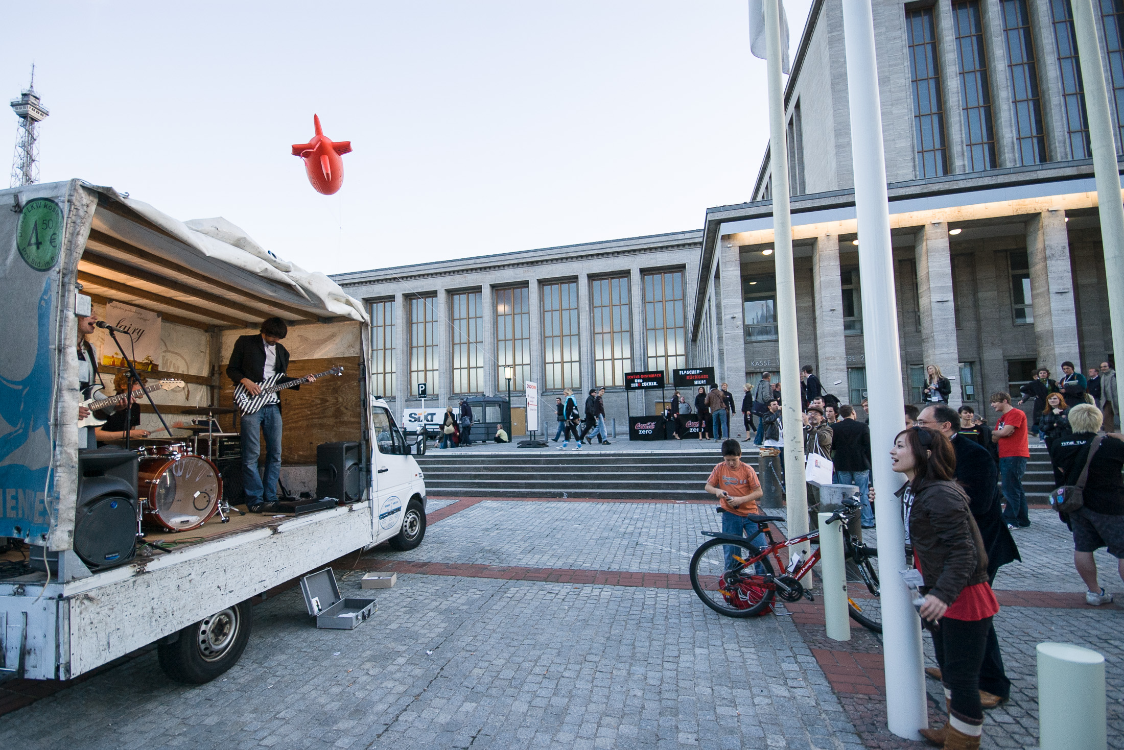 Vor den Türen der Veranstaltung dann Musik zu dritt. In einem Mietwagen mit allem nötigen Brimborium ein nettes Trio. Irgendwie war das sicherlich das popigste der Popkomm. Leidlich gefüllt der Koffer, vielleicht hat sich eine Visitenkarte hineinverirrt. Aber die Besucher sind gewöhnlich nicht von der Art, dass sie etwas zu finden hoffen. Man ist halt da, trifft Freunde. Und man ist auch nicht da. In gewissem Sinne war ich ja auch nicht da.