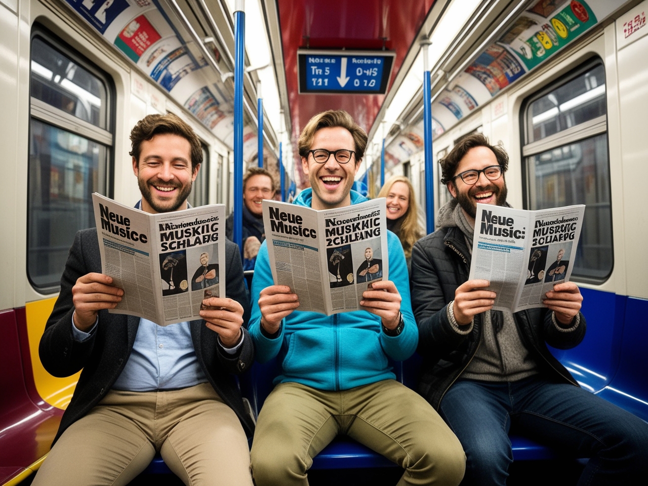 Vibrant characters amidst Berlin’s subway hum, mixed media digital art, a candid scene of everyday joy: People of diverse ages and styles, slumped against sleek yellow and silver train carriages, utterly enthralled by the “Neue Musikzeitung” magazine, their faces beaming with contagious laughter. The colors pop with retro flair – burnt oranges, avocado greens, and electric blues – evoking the dynamic energy of 1980s Berlin. A warm, golden lighting pours in, as if the underground tunnel is bathing in the radiance of a bygone era, while bold lines and playful textures inject a touch of whimsy into this lively, cinematic moment.“ Bzw. ohne Übersetzung und Verbesserung (rechts)